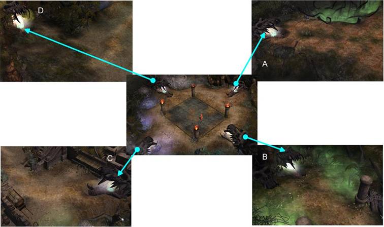 - Ở trung tâm của đầm lầy là khu vực an toàn và có 4 cổng dịch chuyển nằm ở các hướng 1 giờ , 5 giờ , 7 giờ , 11 giờ..